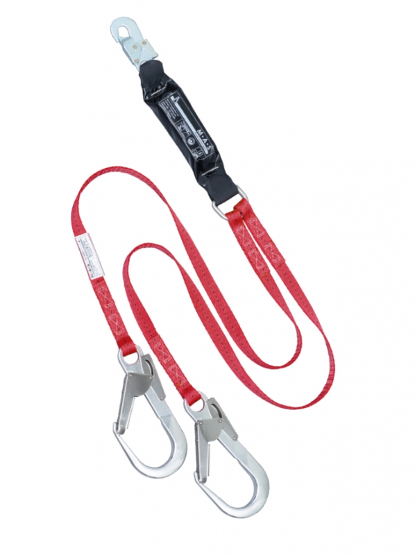 Y-Verbindungsmittel mit Bandfalldämpfer nach EN 354/355 ==================================== - Gurtband 27 mm mit Bandfalldämpfer und Karabiner - auch für den horizontalen Einsatz zugelassen, kantengeprüft - 2x MAS 50
